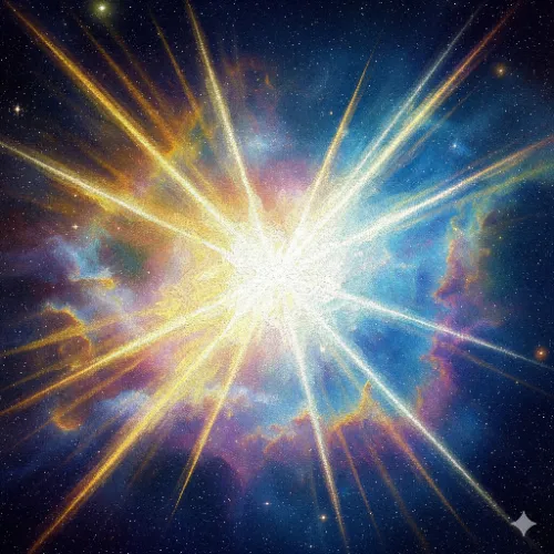 Finish: Radiant light beams with golden, white, and pastel tones blending into a cosmic background